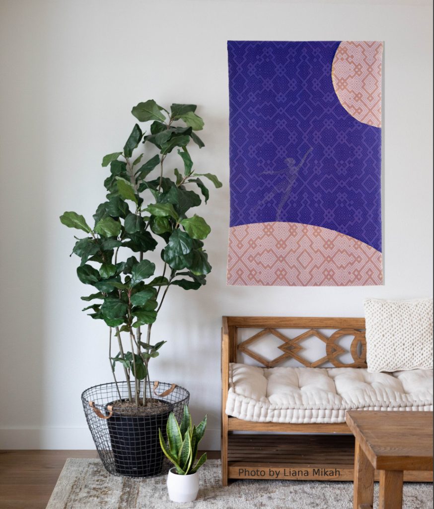 Ripustus: Teoksessa on puinen tanko teoksen yläreunassa ja helmassa. Yläreunan tangossa on silmukat ripustamista varten molemmissa päissä.
